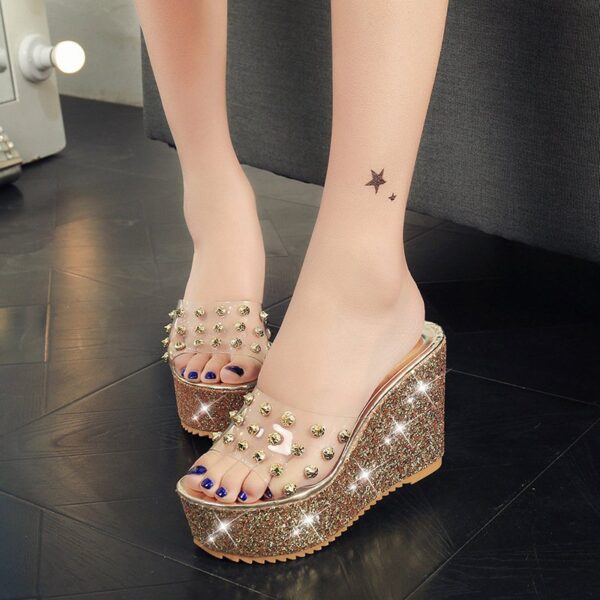 Popular elements: Rhinestones, rivets, platform heels